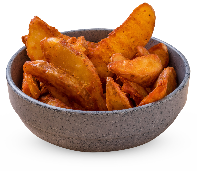 Deliciosas papas en gajo fritas, gratinadas con queso, tocino y parmesano.
